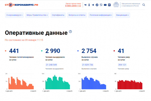 Как сообщается на сайте стопкоронавирус.рф 9 января, днем ранее в России коронавирус диагностировали у 3 127 человек, за все время обнаружено 21 829 736 случаев.