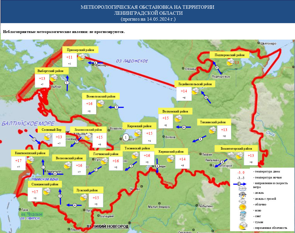 Температура воздуха в большинстве районов не опустится ниже +12 градусов Во вторник, 14 мая, на территории Ленинградской области сильно потеплеет.