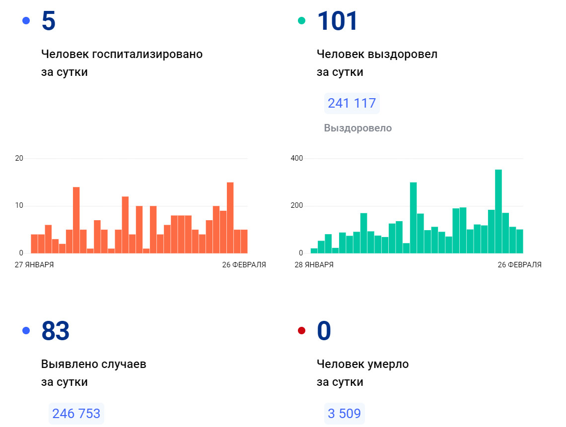 Отмечается, что 101 пациент выздоровел, состояние еще пяти ухудшилось, так что их лечение продолжится в больнице. При этом новых летальных случаев, как и весь последний месяц, не зафиксировано.