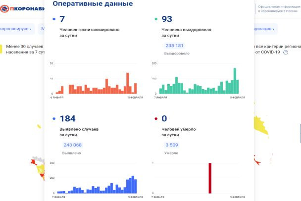 В России, по данным на 5 февраля, ковид диагностировали у 9 410 человек (4 февраля — у 9 681 человека, что стало пиком за осенне-зимний период). Как сообщается на сайте стопкоронавирус.рф, за все время выявлено по стране 21 996 744 случая заболевания.