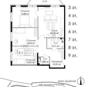 3-к. квартира, 84.5 м², 3/9 эт.