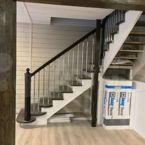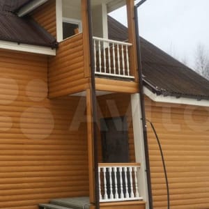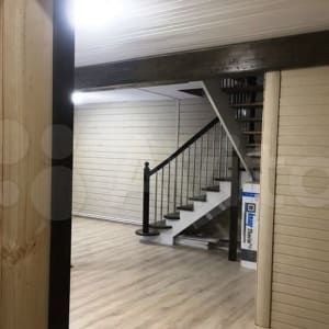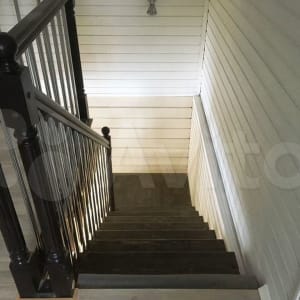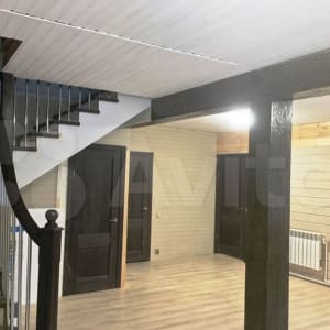 Отделка сделана по оригинальному дизайн проекту. Лестница из лиственницы с гнутым поручнем (280 т.р., на потолке декоративные брашированные под старину фальшбалки и лейд подстветкой 110 т.р. и т.д.)