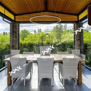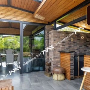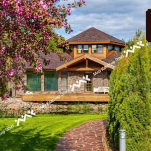 Дом, площадью 250 кв.м, не считая террас, стоит на пруду, в котором водится рыба. Дом построен по индивидуальному проекту, облицован кирпичом. Дизайн и интерьер дома внутри выполнен в Прованском стиле и оснащён современной бытовой техникой.