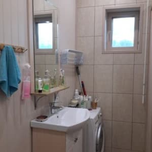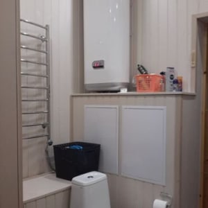 1-ый этаж: большая кухня-гостиная (с камином, раскладной двуспальный диван), большой совмещенный санузел (теплый пол, душевая кабина, стиральная машина, водонагреватель), прихожая (со шкафом-купе), полностью застекленная веранда.